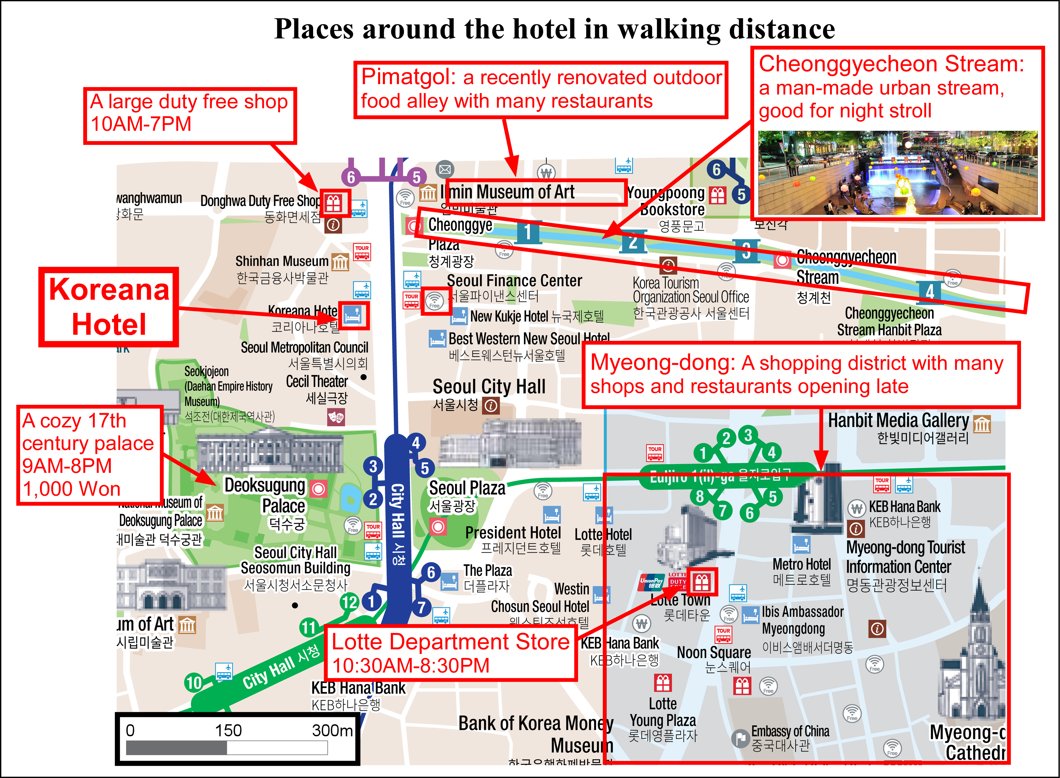 At the heart of downtown Seoul, there are many shopping and sightseeing places around the hotel within walking distance. Some of the most nearby places are summarized below.