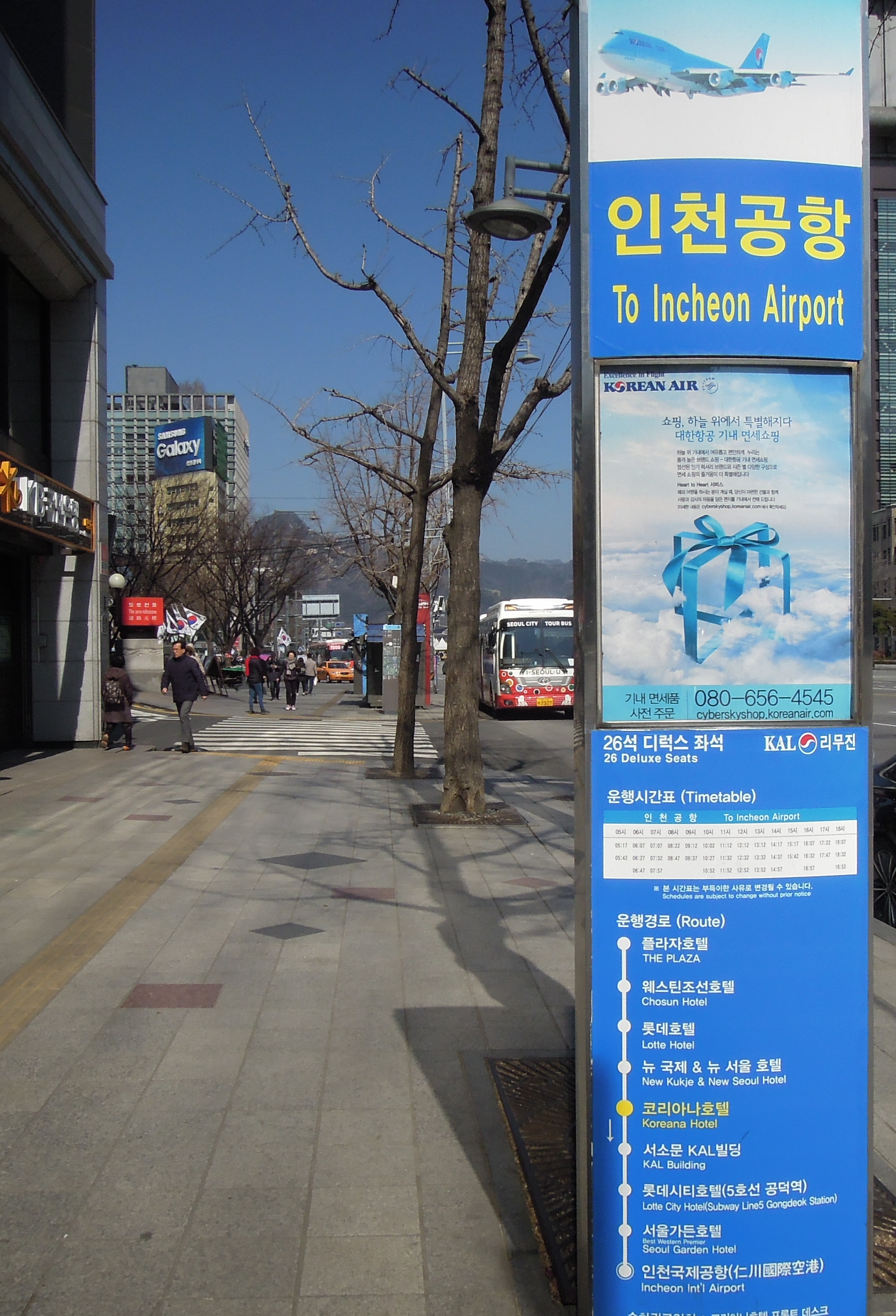 On your way back home, you can also use the limousine bus from Koreana Hotel back to Incheon Airport. You can buy the bus ticket right at Koreana Hotel reception desk. Purchasing in advance is recommended to secure seats.| Bus stop is right in front of the hotel. |